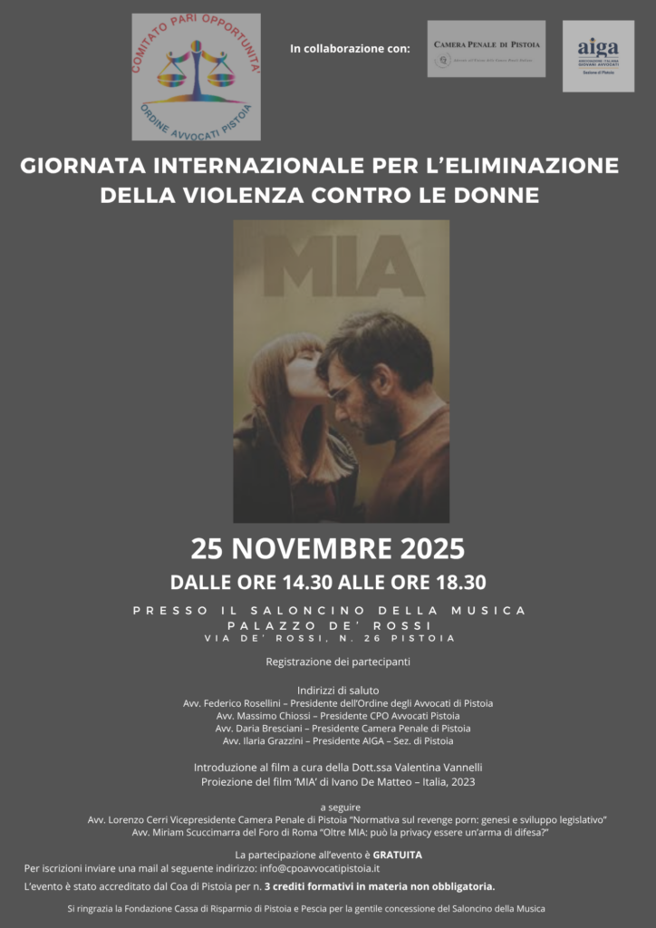 Il Comitato Pari Opportunità dell’Ordine Avvocati di Pistoia, in collaborazione con la Camera Penale di Pistoia e la locale Sezione AIGA, ha organizzato per il prossimo 25 Novembre un incontro nell’ambito della Giornata Internazione per l’eliminazione della violenza contro le donne.