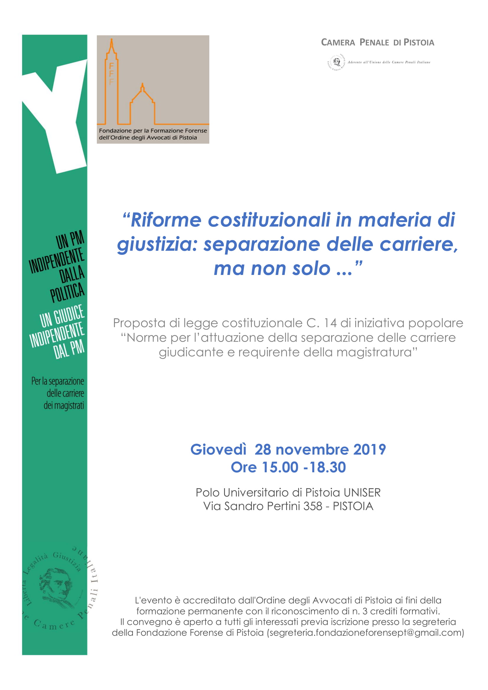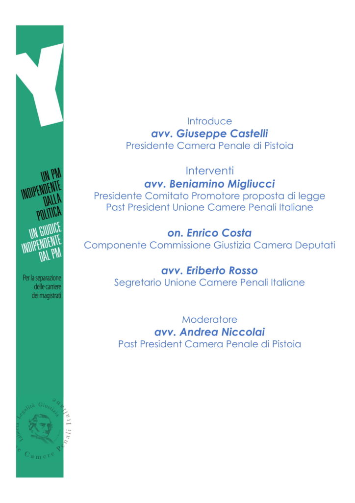 28 novembre 2019: un incontro sulla separazione delle carriere in magistratura. By Camera Penale Pistoia|2019-11-19T12:50:12+01:00Novembre 19th, 2019|Agenda| Condividi questo articolo. FacebookTwitterLinkedInTumblrTelegramEmail
