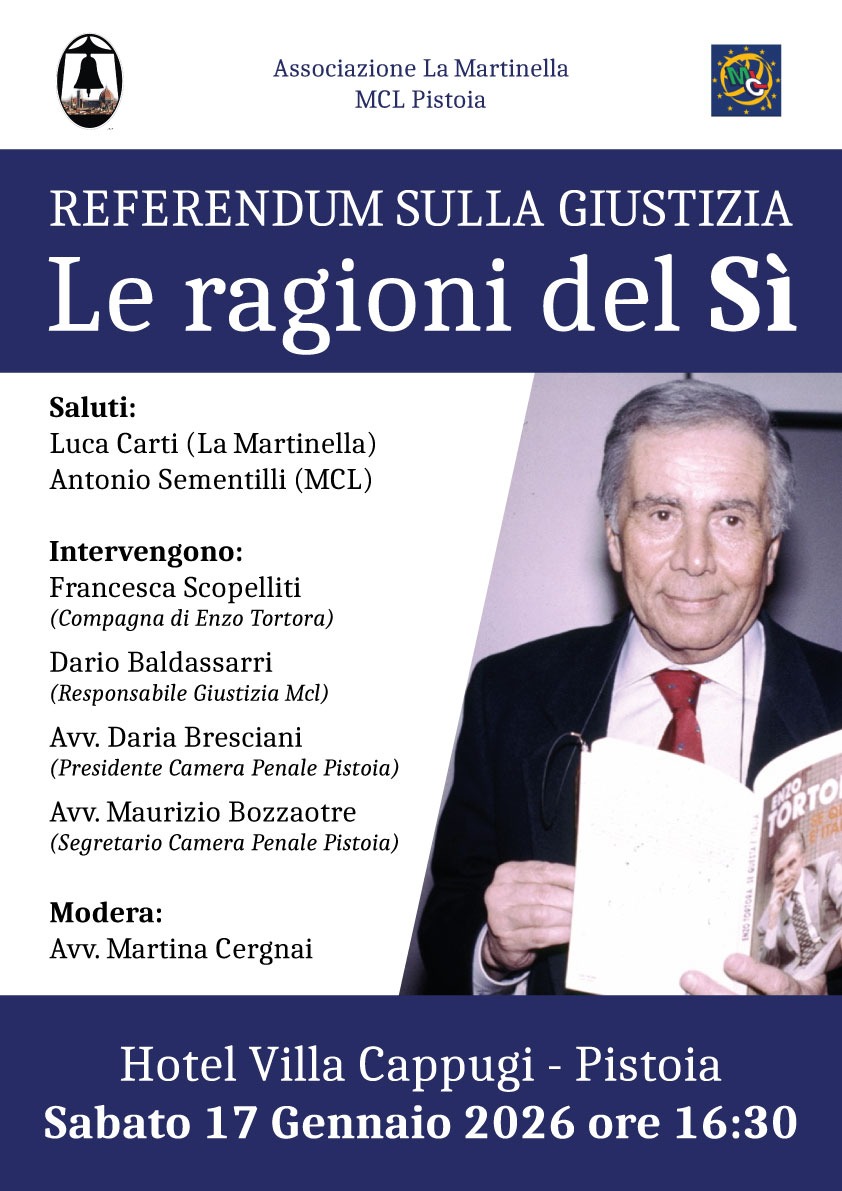 Sabato 17 gennaio a Pistoia, un’iniziativa organizzata da MCL Pistoia e dall’Associazione La Martinella sulle (tante) ragioni per votare SI al prossimo referendum costituzionale. Parteciperanno Maurizio Bozzaotre, Francesca Scopelliti, Daria Bresciani e Dario Baldassarri.